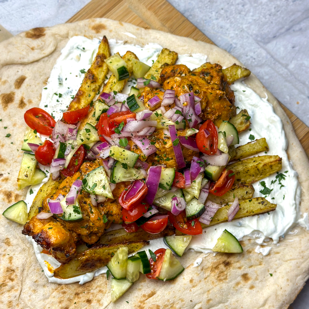 - Toppings: Tzatziki Sauce, French Fries, Cucumber, Tomato & Red onion