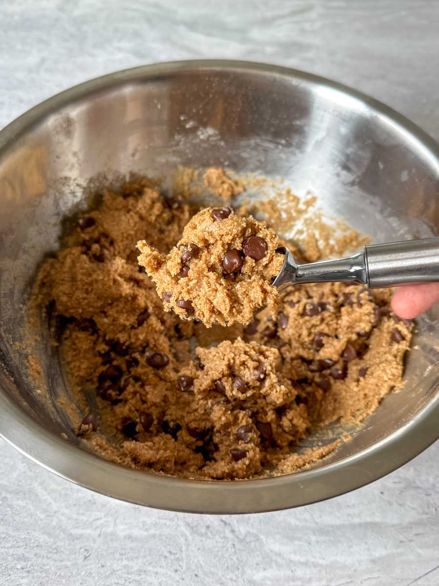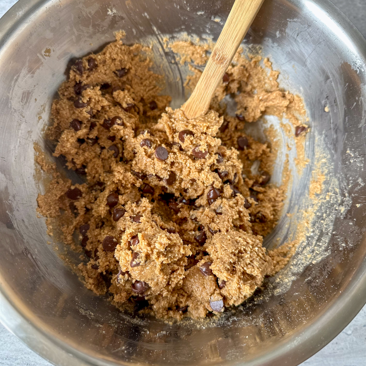 - Gently fold in the semi-sweet chocolate chips until they are evenly distributed throughout the mixture.