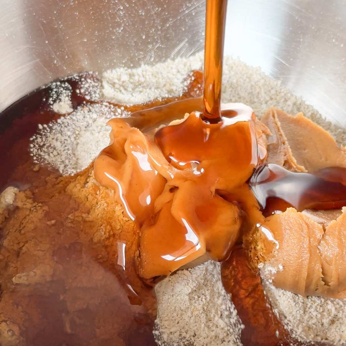- In a large mixing bowl, combine the oat flour, peanut butter, maple syrup, and kosher salt. Mix well until the ingredients are thoroughly combined. The mixture may become stiff, so you might find it easier to mix and mash with your hands.