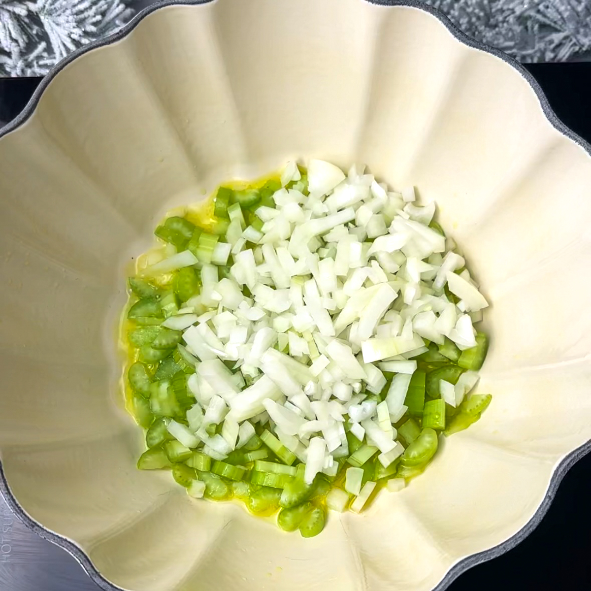 Sauté the diced celery and onions over medium heat!