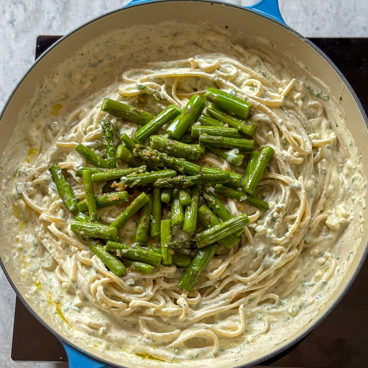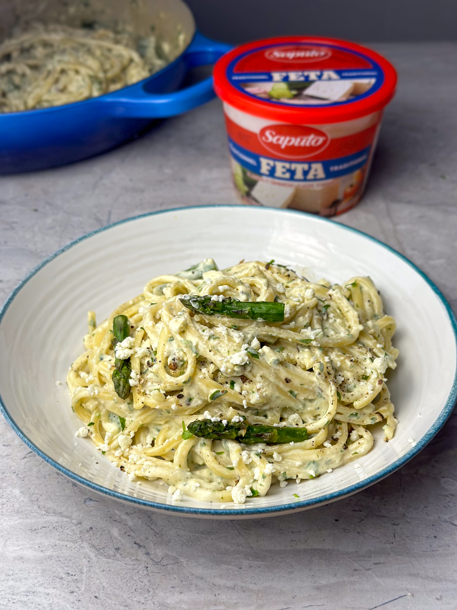 - Combine and Serve: Add the cooked pasta to the hot pasta sauce, tossing to coat evenly. Remove from heat and pour over the lemon feta sauce, mixing well. Gently fold in the cooked asparagus.