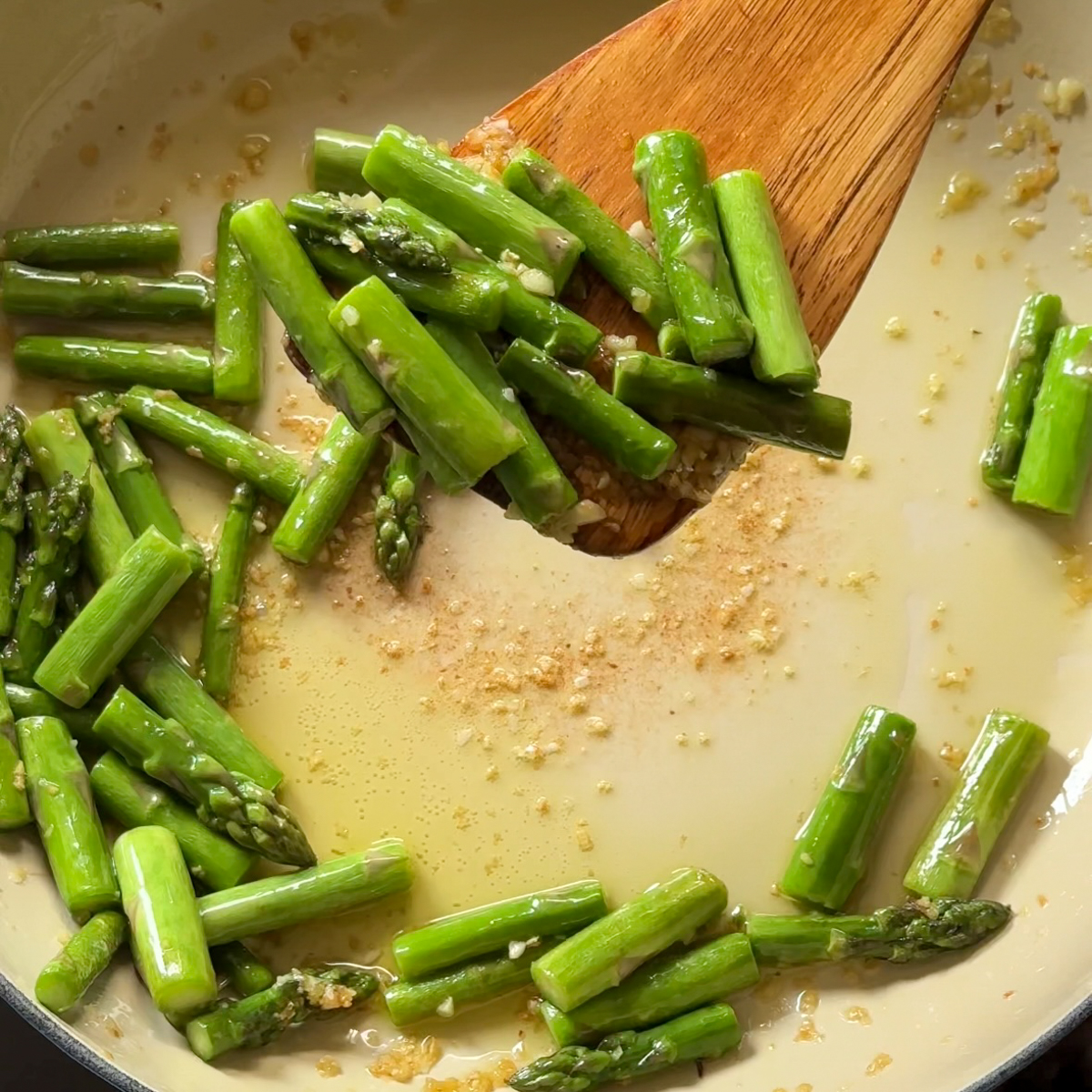 - Cook the Asparagus: In a large skillet over medium heat, heat 1 tablespoon of olive oil. Add the minced garlic and sauté until fragrant, about 1 minute. Add the asparagus pieces, season with salt and pepper, and cook until tender-crisp, about 5-7 minutes. Remove the asparagus from the skillet and set aside.