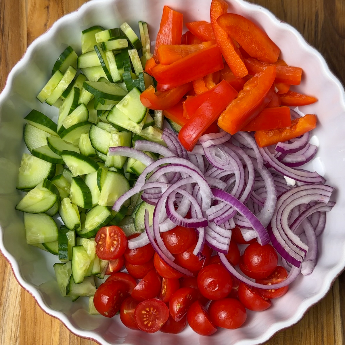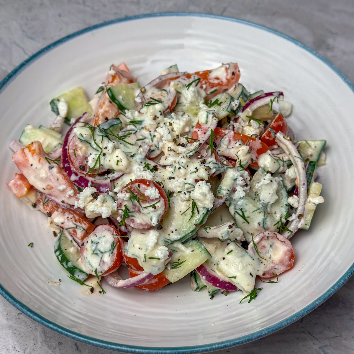 3. Serve overtop chopped tomatoes, cucumbers & red onion, mix well. Garnish with extra feta cheese. Enjoy your new fav Greek Salad!