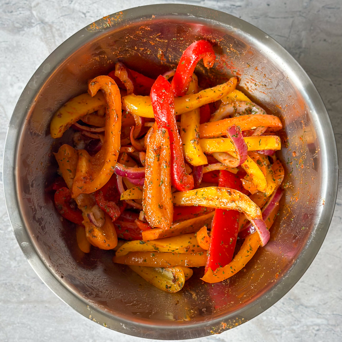 - Slice the bell peppers and red onion as specified. In a separate bowl, toss them with salt, garlic powder, smoked paprika, parsley flakes, and olive oil until evenly coated.