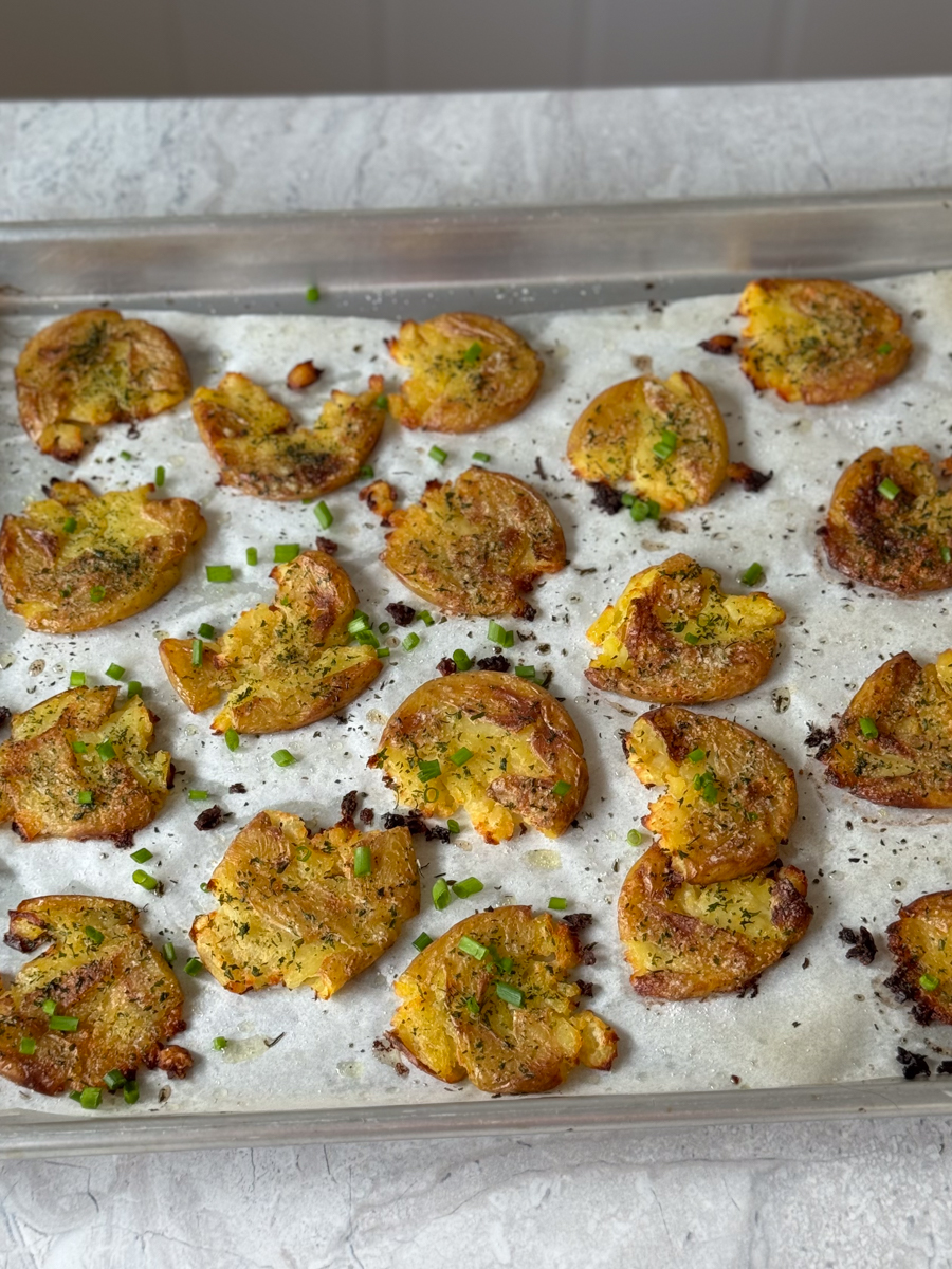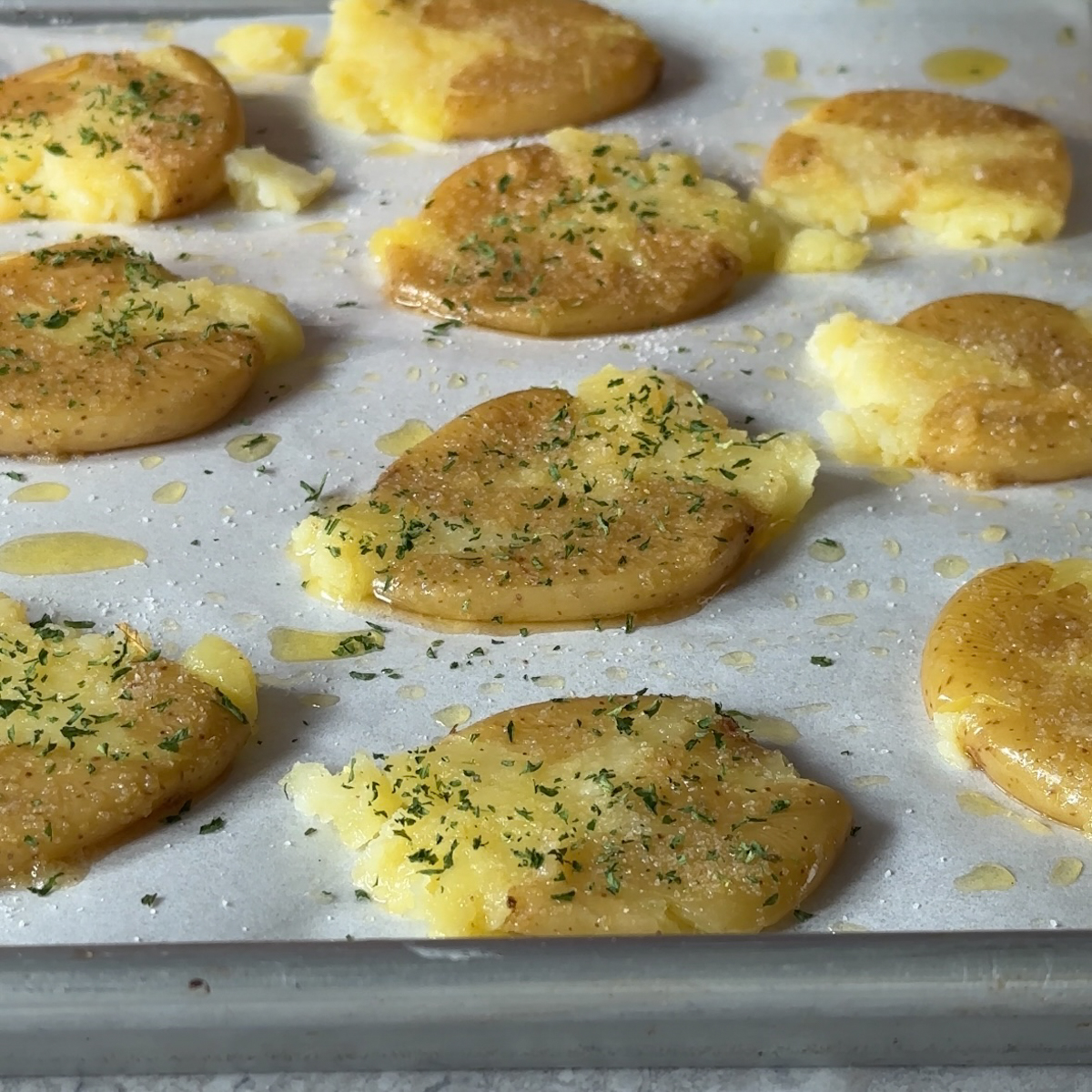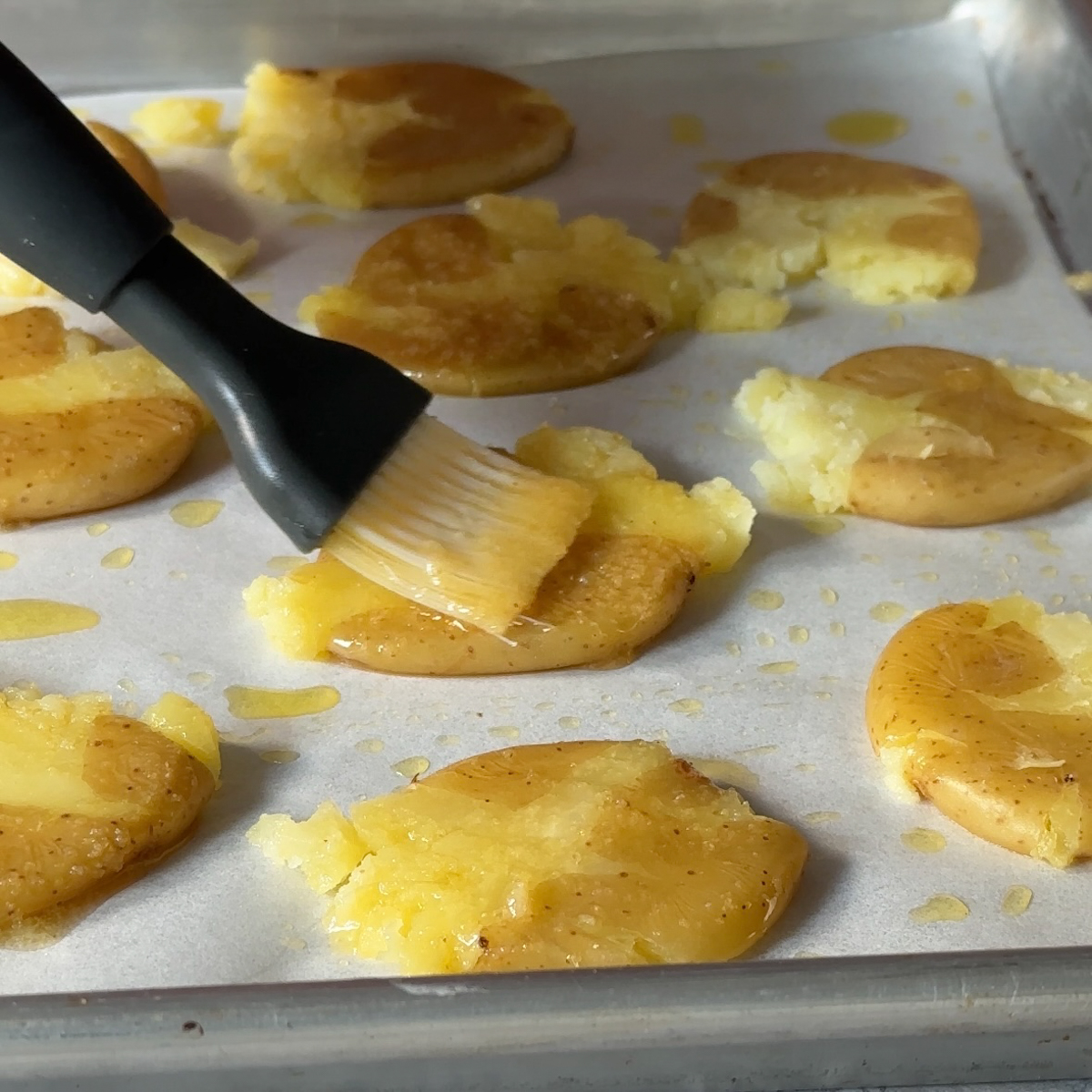 - Transfer the boiled potatoes to the sheet pan and coat them with the olive oil. Use a glass or measuring cup to gently smash the potatoes to about ½ inch thickness. Brush some melted butter on top before seasoning with salt, pepper & parsley.
