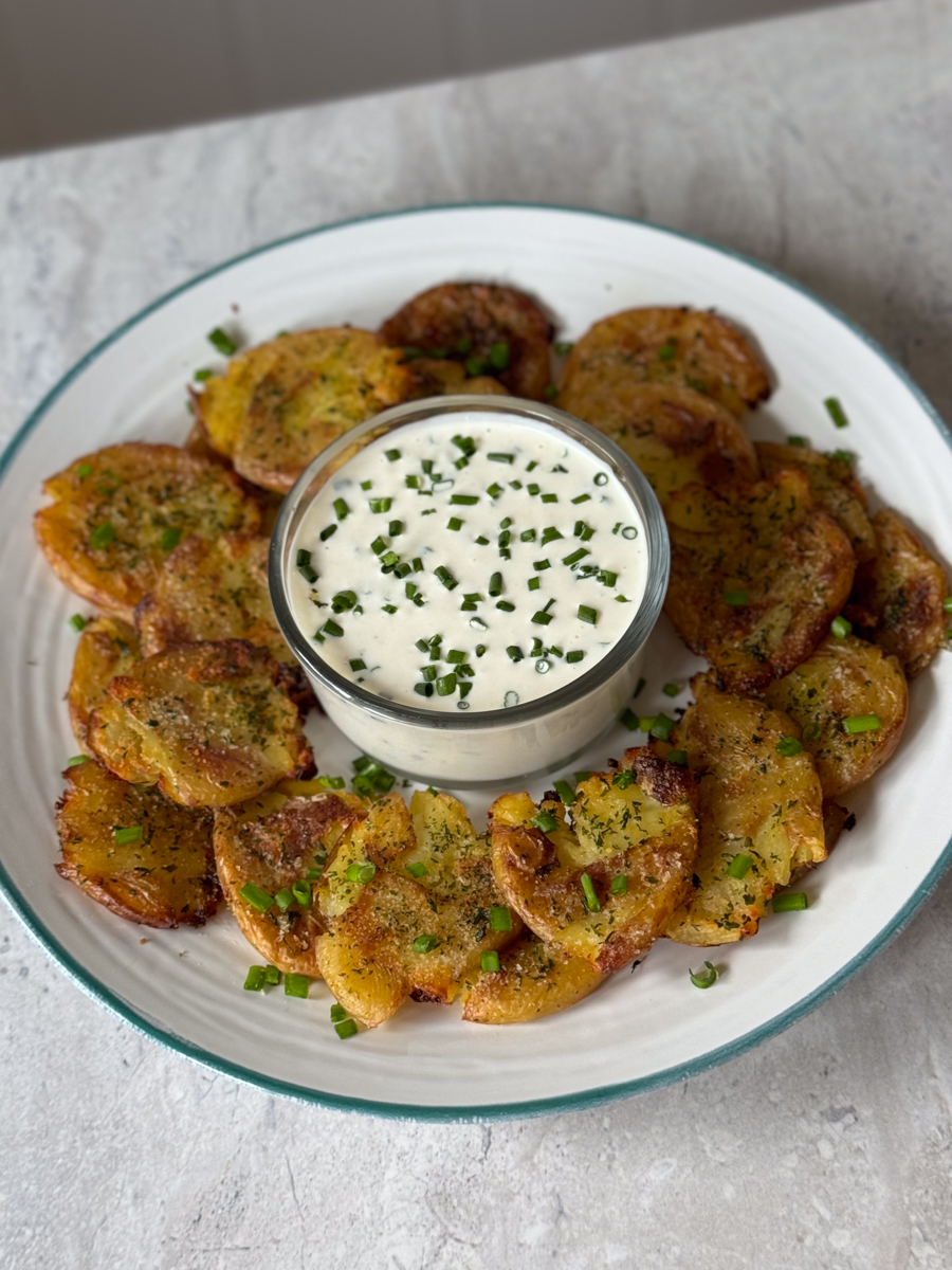 - Serve the roasted smashed potatoes with the lemony chive yogurt sauce on the side. Enjoy your flavorful dish!