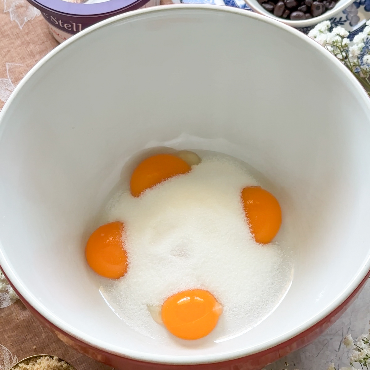 Add egg yolks & white sugar. Mix with a hand mixer.