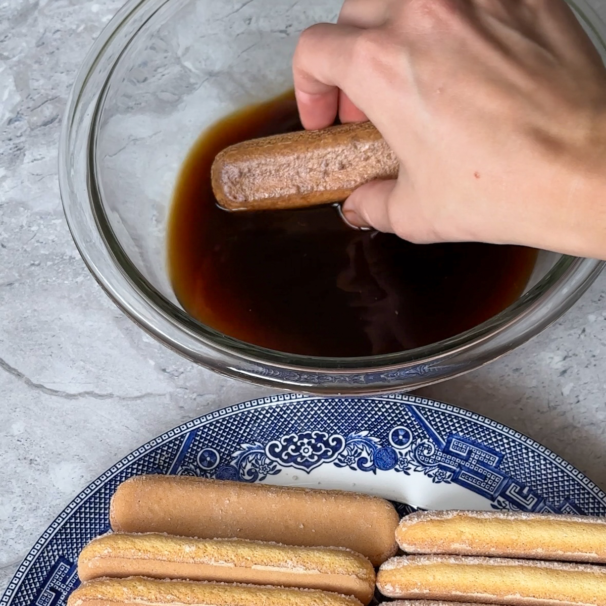 2. Dip ladyfingers into espresso mixture briefly, ensuring they're soaked but not soggy.