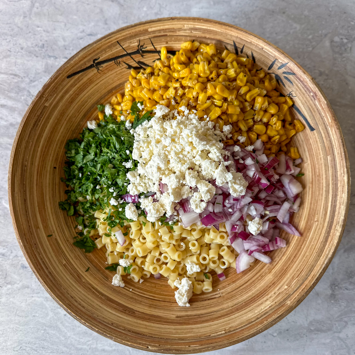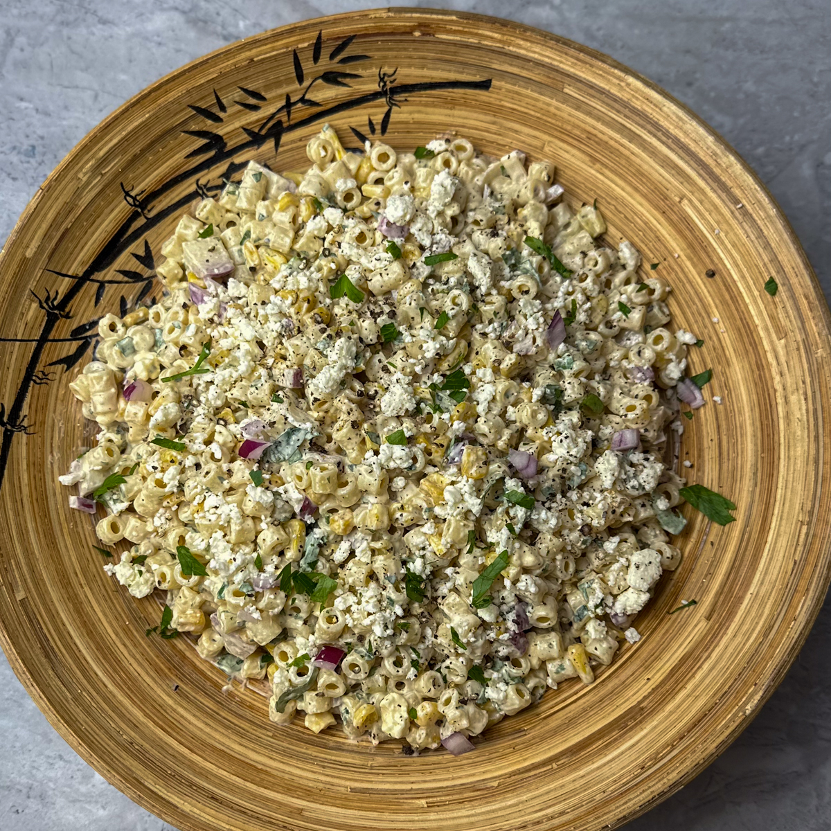- Mix the Salad: In a large bowl, combine the cooled pasta, charred corn, diced red onion, chopped parsley, and sliced scallions.