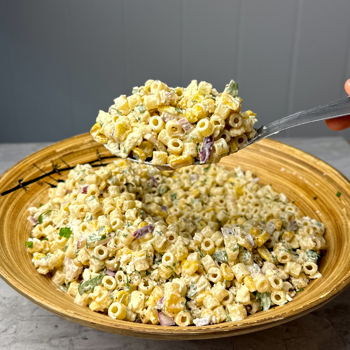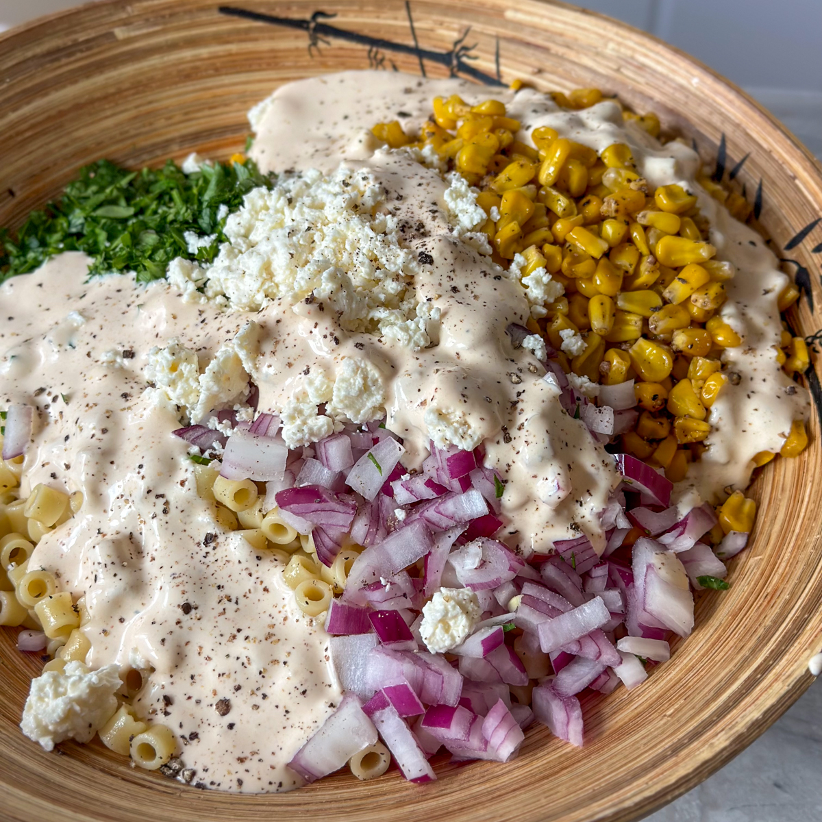 3. Mix the Salad: In a large bowl, combine the cooled pasta, charred corn, diced red onion, chopped parsley, and sliced scallions.