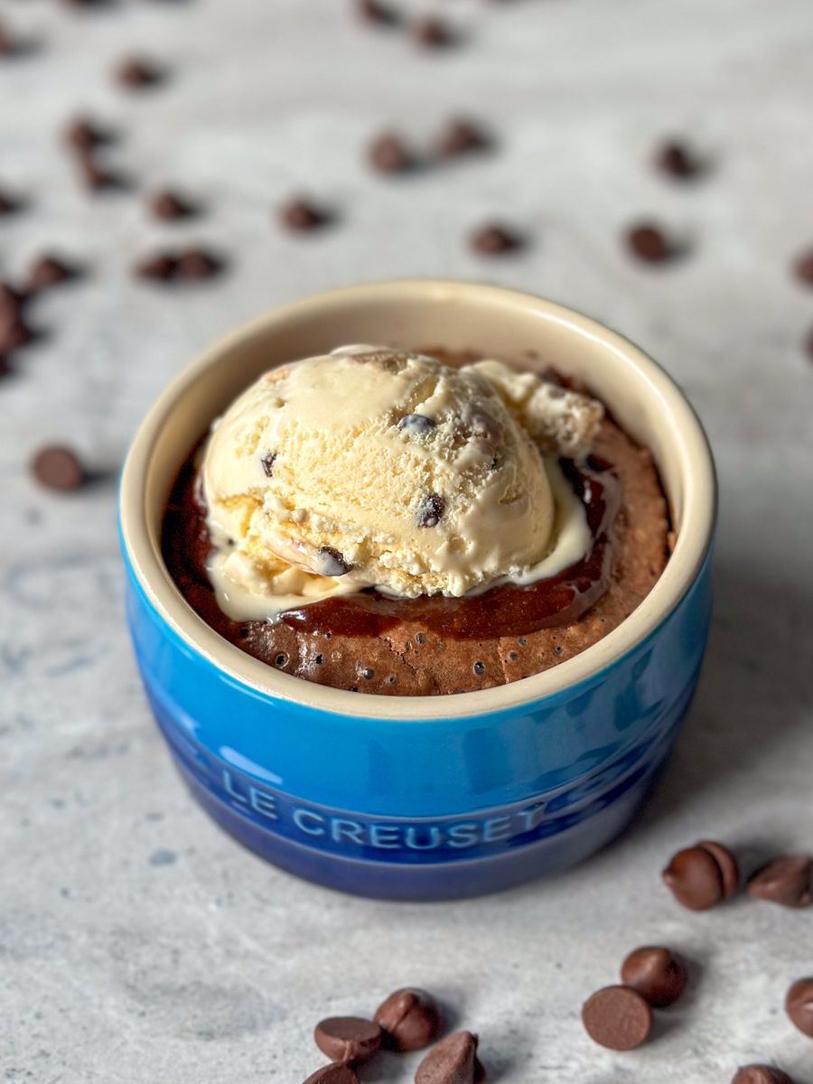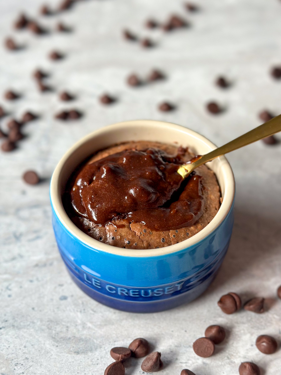 - Pour Batter: Pour the batter into a greased, oven-safe dish. A 4 ½-inch-wide ramekin works well. You can also divide the batter into two smaller dishes, but note that the baking time will be shorter.