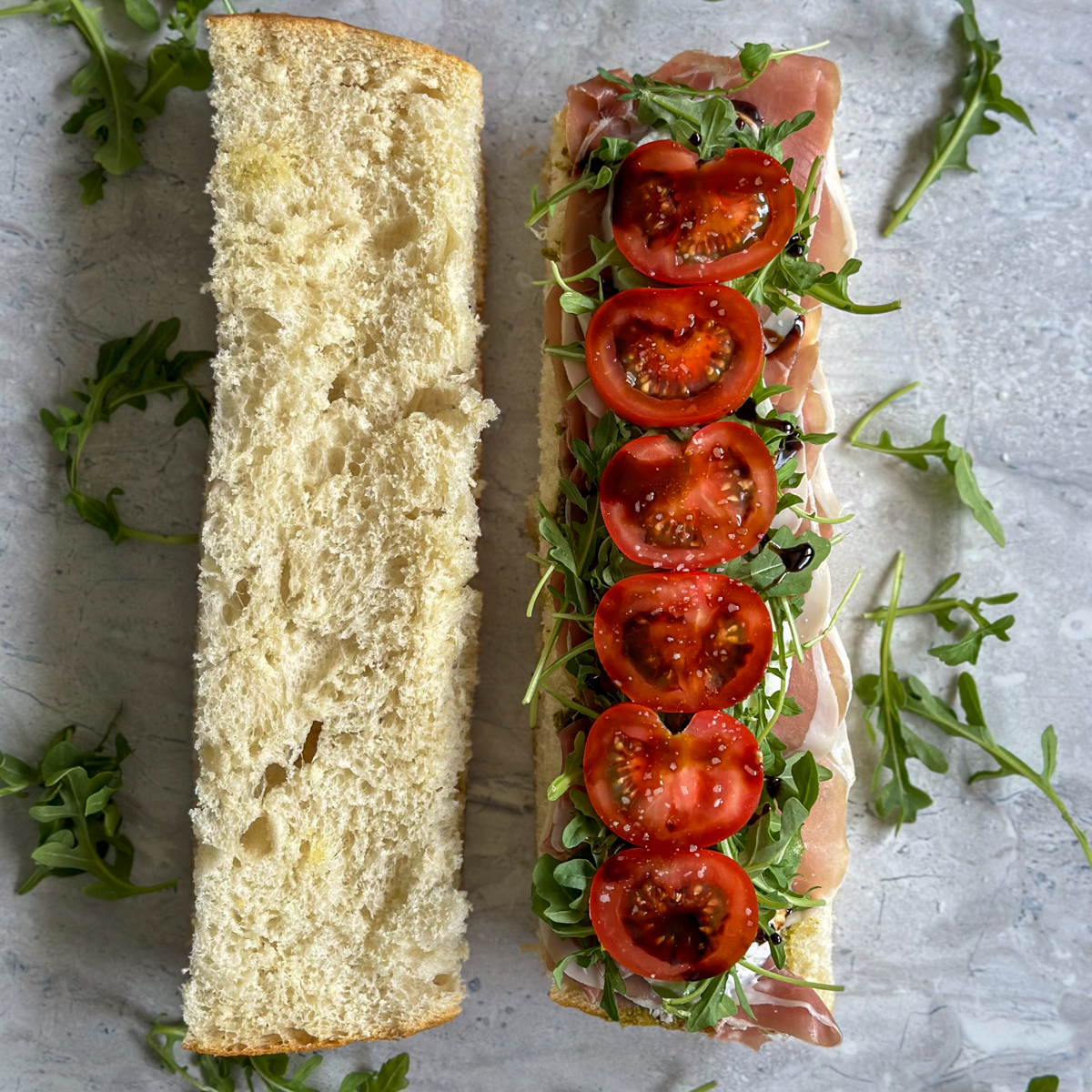 - Firstly prepare your focaccia bread for your sandwich by cutting a piece in half.