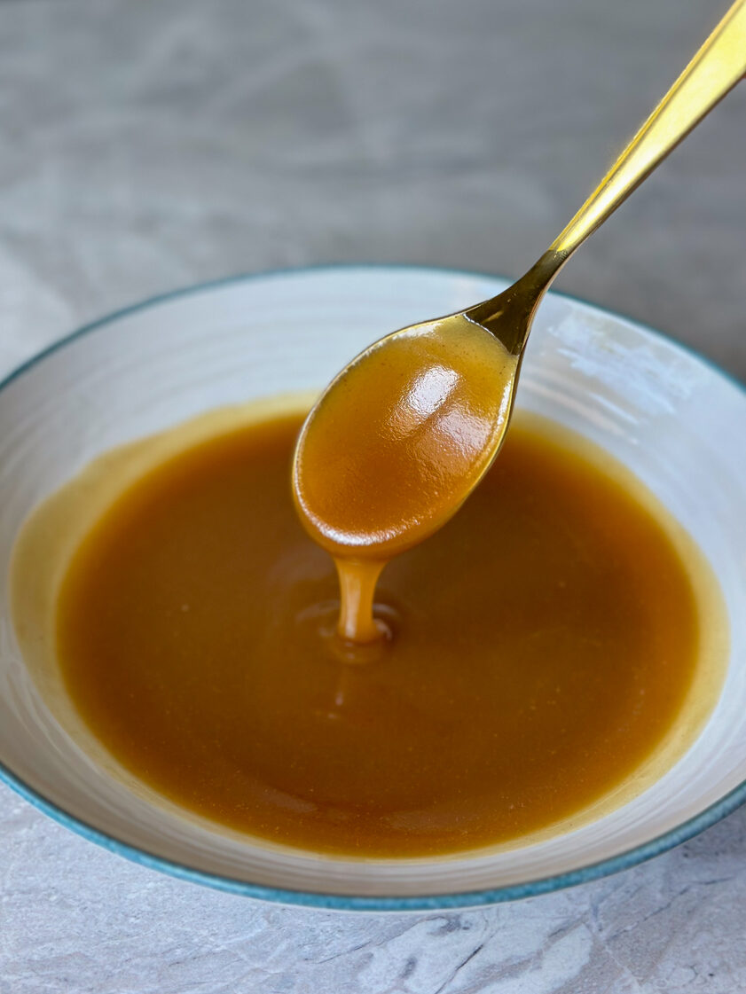Enjoy this viral olive oil caramel sauce as a delightful topping or dip for your sweet treats!